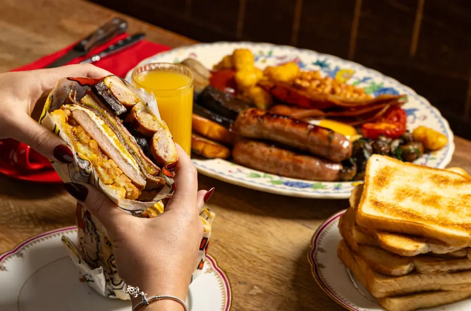- The Ultimate English Breakfast – a full plate featuring back bacon, sausage, fried eggs, hash browns, fried toast, beans, white and black pudding, hickory-roasted tomatoes, and garlic butter mushrooms, served with orange juice, tea, and toast.